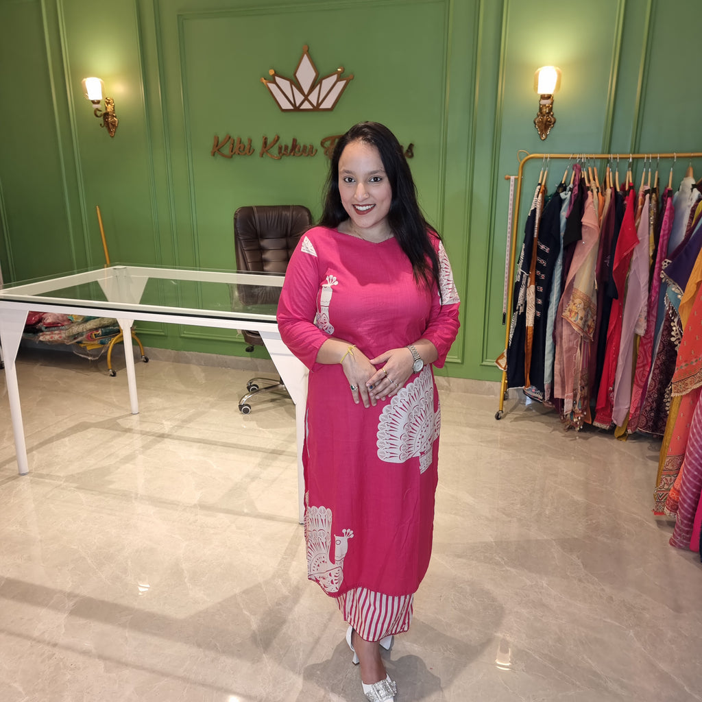 Make a bold statement with this Pink Peacock Print Cotton Cordset, a perfect blend of tradition and modern style. Crafted from premium 100% cotton fabric, this outfit ensures all-day comfort while keeping you effortlessly chic. The kurta features golden peacock motifs, adding a regal touch, and comes with functional side pockets for convenience. The striped pants complement the kurta, creating a stylish contrast ideal for casual and festive wear.
