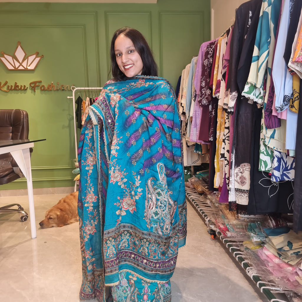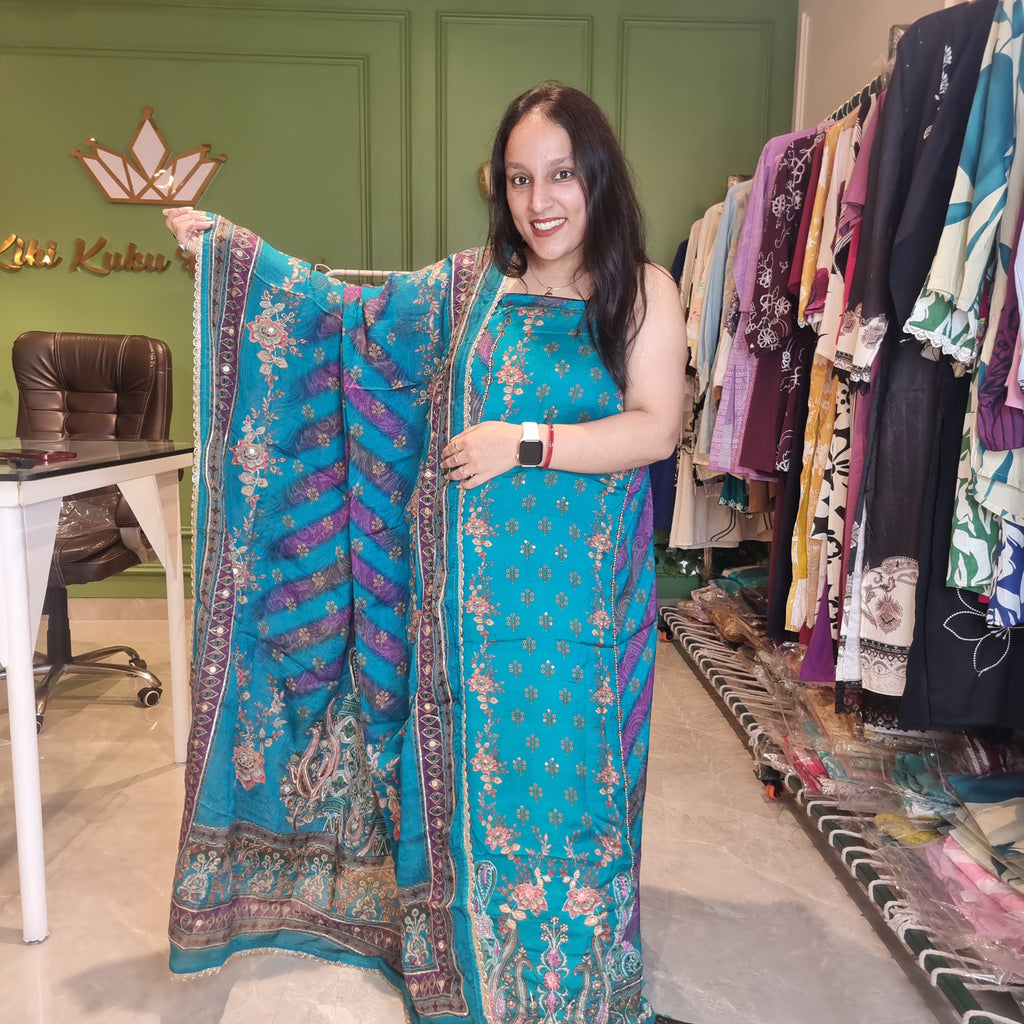 Step into elegance with this Beautiful Unstitched Suit in a striking teal base, highlighted with delicate embroidery and intricate detailing. The set comes with a stunning dupatta that enhances the overall look with its vibrant design and rich borders. Perfect for festive occasions, parties, or casual gatherings, this suit brings together grace, comfort, and style in one.