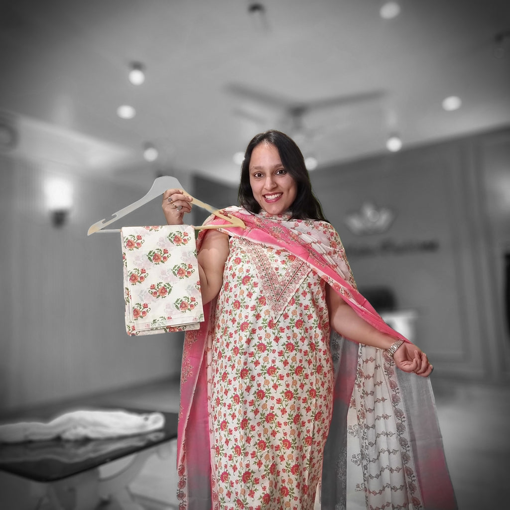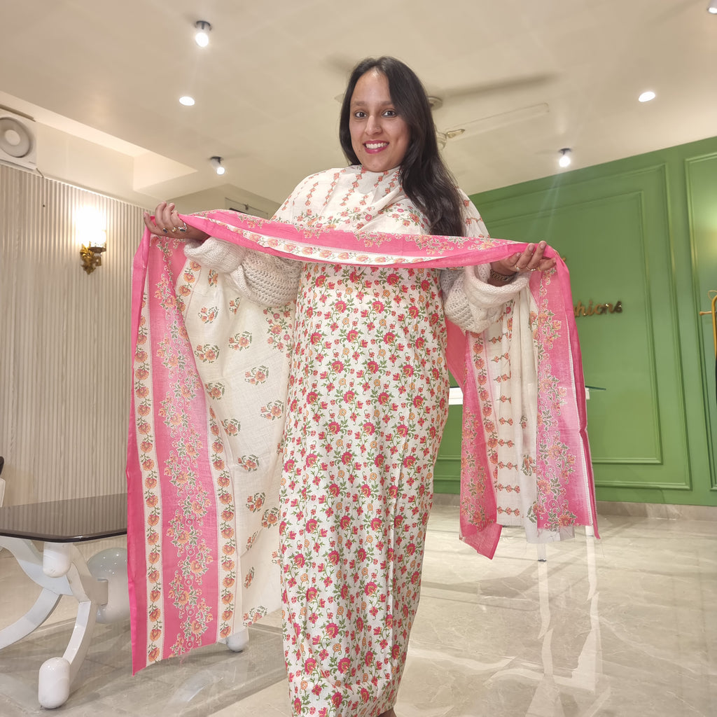 Elevate your ethnic wardrobe with this beautifully crafted cotton suit set, designed for elegance and comfort. Featuring a soft, breathable cotton fabric, this outfit is adorned with a delicate floral print in shades of pink and green, exuding a fresh and graceful look. The kurta is detailed with intricate embroidery on the neckline, adding a touch of sophistication. Paired with a matching dupatta featuring a contrasting pink border, this set is perfect for casual gatherings, festive occasions, or everyday wear.