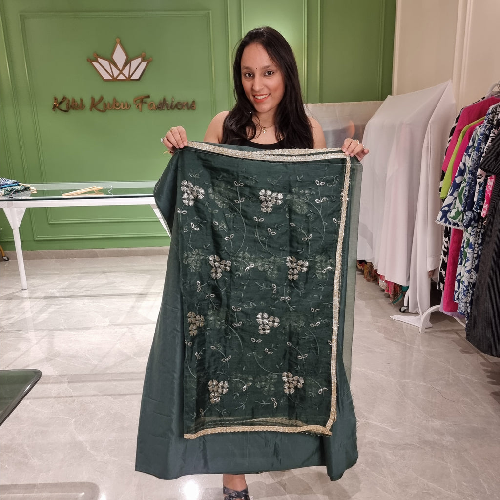 Step into elegance with the Emerald Elegance Suit, a stunning ensemble designed to make you shine. Featuring a beautifully embroidered V-neck front, this suit exudes grace and sophistication. The charming sequin work on the dupatta adds a touch of sparkle, making it perfect for festive occasions, parties, and celebrations. The rich deep green hue, paired with delicate floral patterns, brings a timeless appeal to your wardrobe. Crafted with high-quality fabric, this outfit ensures both comfort and style.