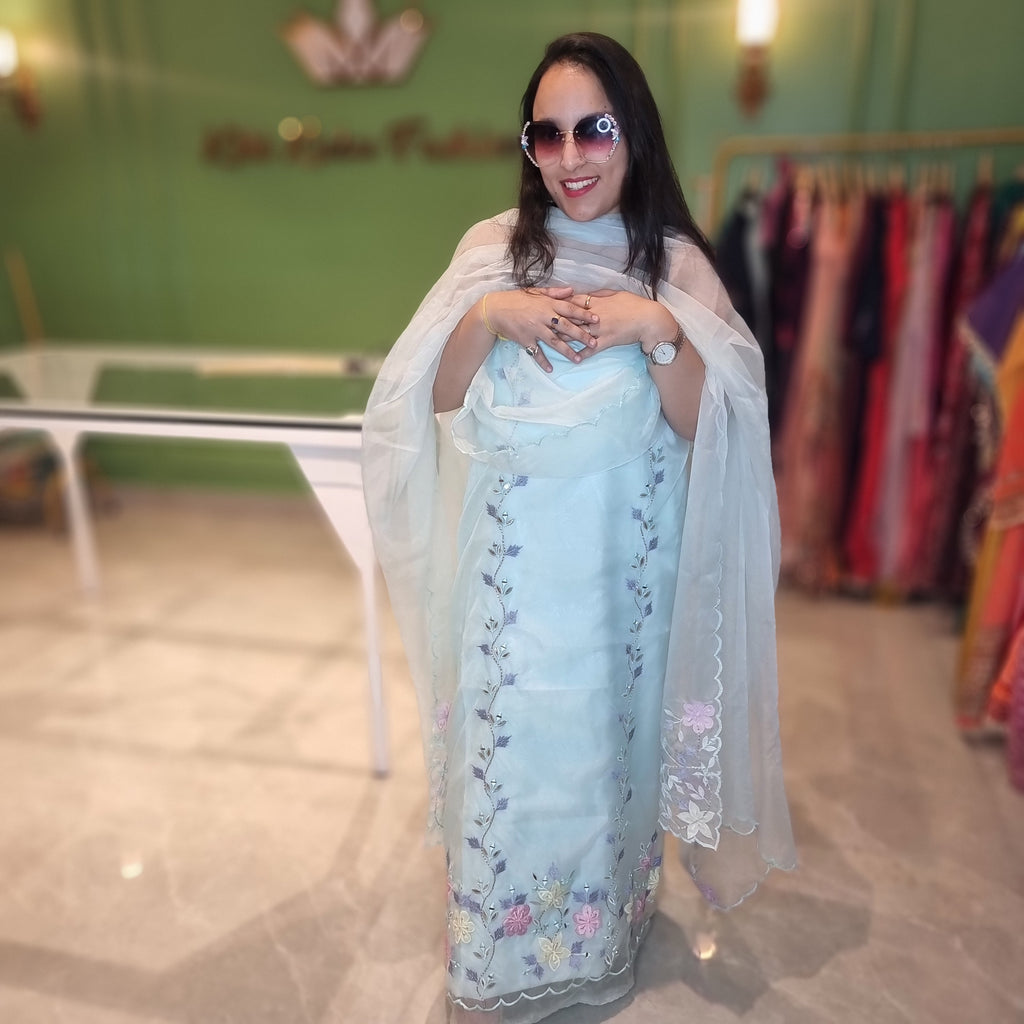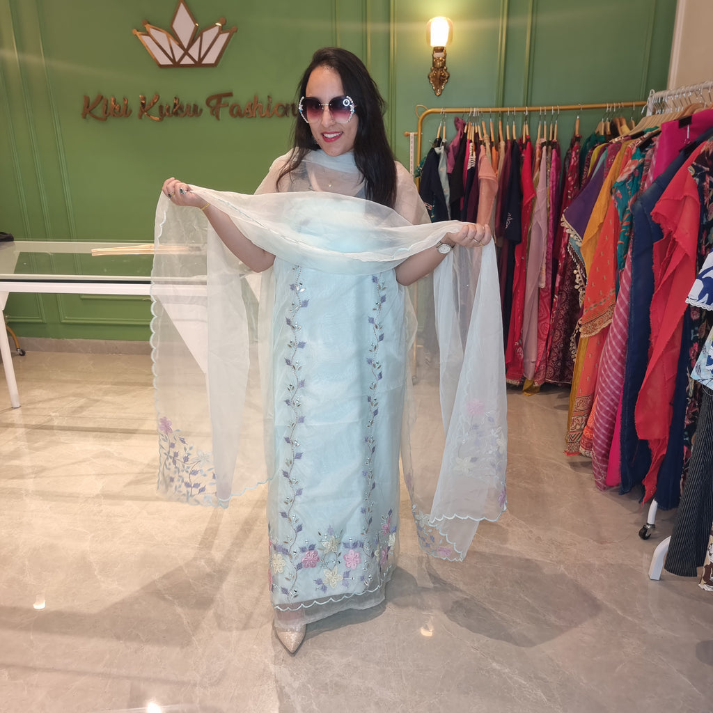 Step into effortless elegance with Frosted Bloom — a serene pastel blue georgette suit set designed to turn heads. This unstitched ensemble features a delicately embroidered shirt with a soft lining for added comfort and sophistication. The floral threadwork on the dupatta adds a dreamy touch, making it ideal for summer festivities, casual gatherings, or day functions.