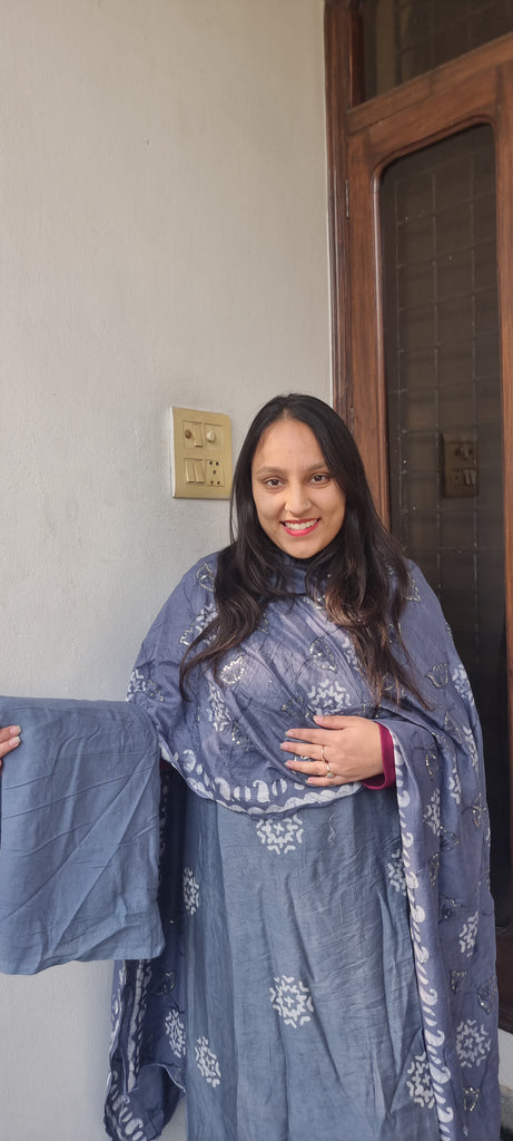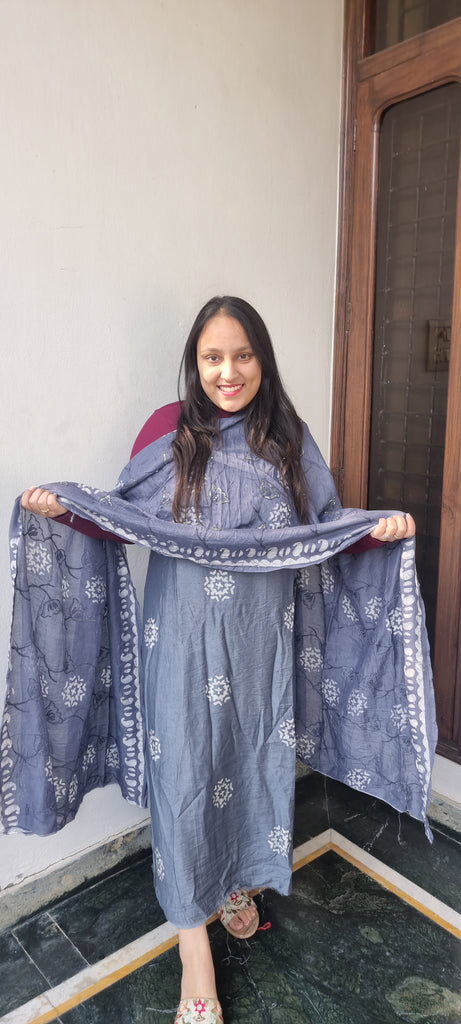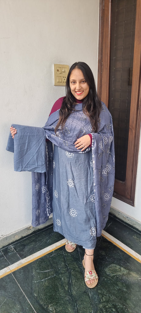 Enhance your ethnic collection with this stunning Batik Print Unstitched Suit in an elegant blue shade. The kurta features a beautiful block print design on the neckline, adding a refined charm to the outfit. Paired with a matching printed dupatta and a plain bottom fabric, this suit strikes the perfect balance between tradition and sophistication. Crafted from premium-quality fabric, it ensures both comfort and effortless grace, making it an ideal choice for casual wear, festive gatherings, or special occasions.
