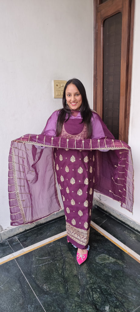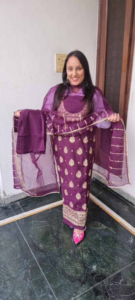 This elegant suit set is crafted from mul cotton fabric, known for its soft and breathable texture, ensuring comfort and style. The heavy neckline is intricately designed with fine embroidery, adding a luxurious touch to the outfit. The suit features delicate embroidery work throughout, enhancing its rich and traditional appeal. The ensemble includes a matching dupatta with detailed embellishments and a well-structured lining for added durability and comfort. Perfect for festive occasions, weddings, or special gatherings, this suit blends traditional craftsmanship with modern elegance.