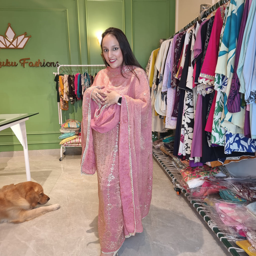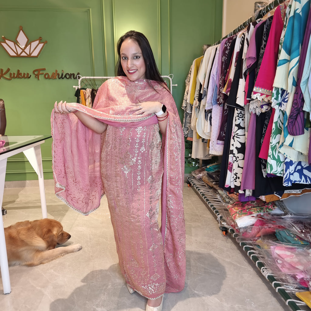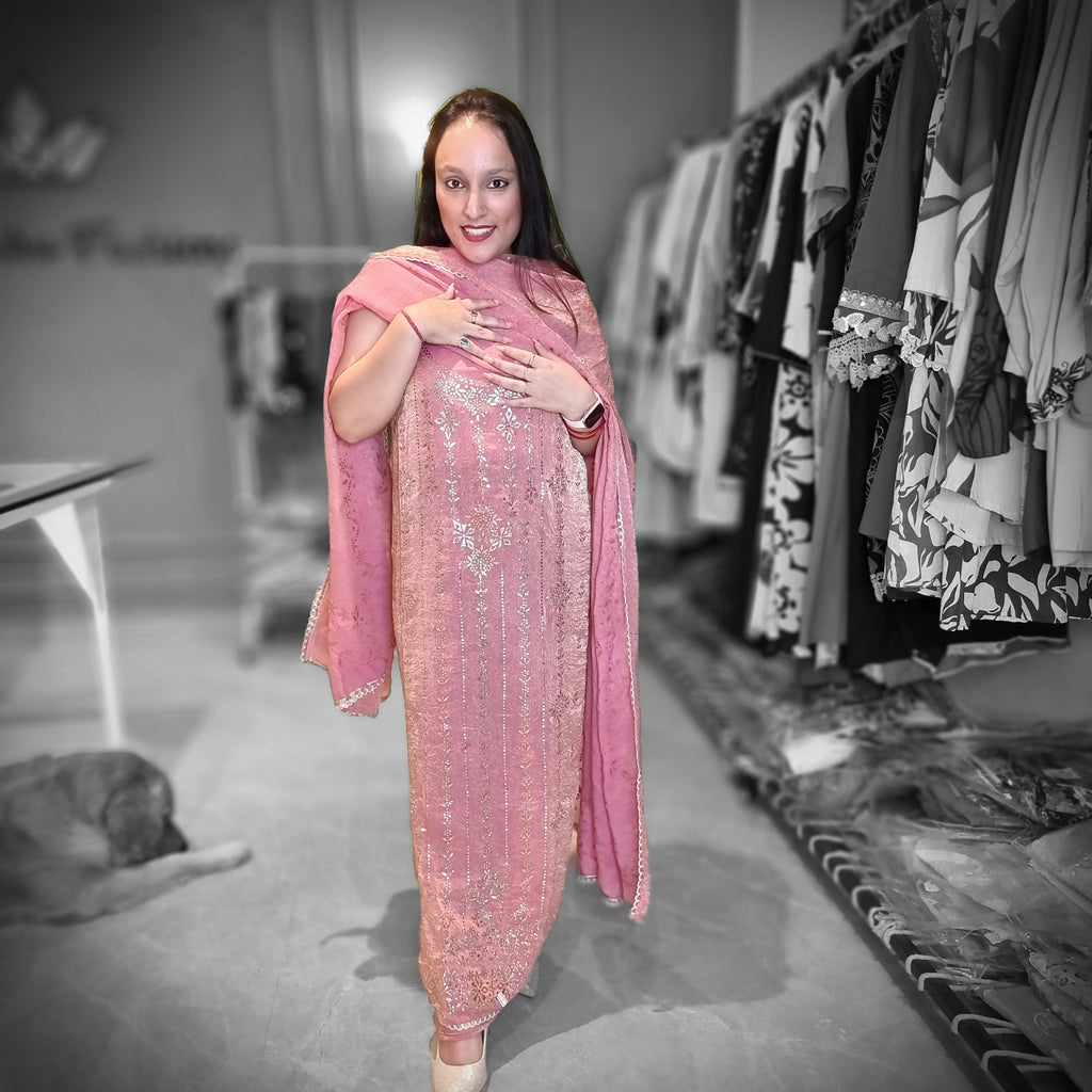 Turn heads with this Elegant Unstitched Suit in a soft blush pink shade. Crafted on a luxurious shimmer base, the suit features all-over intricate embroidery with delicate sequin highlights, giving it a perfect festive and partywear appeal. The matching embroidered dupatta adds grace and completes the sophisticated look.