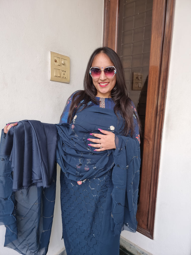 Step into timeless sophistication with our Midnight Elegance Georgette Suit. Crafted from premium georgette fabric, this exquisite ensemble features delicate sequence work and intricate thread embroidery on the neckline, adding a touch of grace and charm. The elegant deep navy hue enhances its regal appeal, while the lightweight and breathable material ensures comfort throughout the day. Paired with a matching embroidered dupatta, this suit is perfect for festive occasions, evening gatherings, and special celebrations.