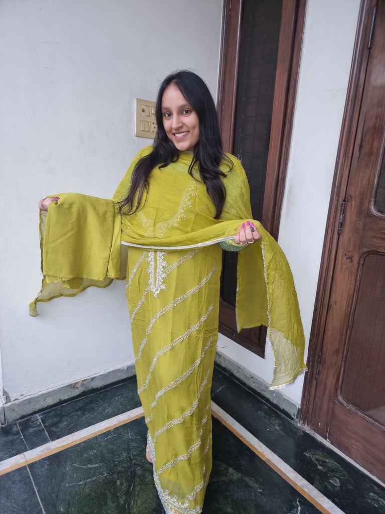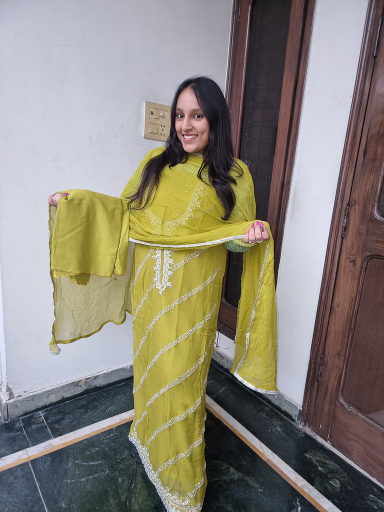 Make a statement with this elegant Olive Green Organza Suit, designed for those who love sophistication with a touch of glamour. The suit features exquisite kardana work with a heavy embroidered neckline, adding richness to its overall appeal. The lightweight organza fabric drapes beautifully, making it perfect for party wear. Complemented by a matching dupatta and santoon bottom, this outfit ensures both style and comfort.
