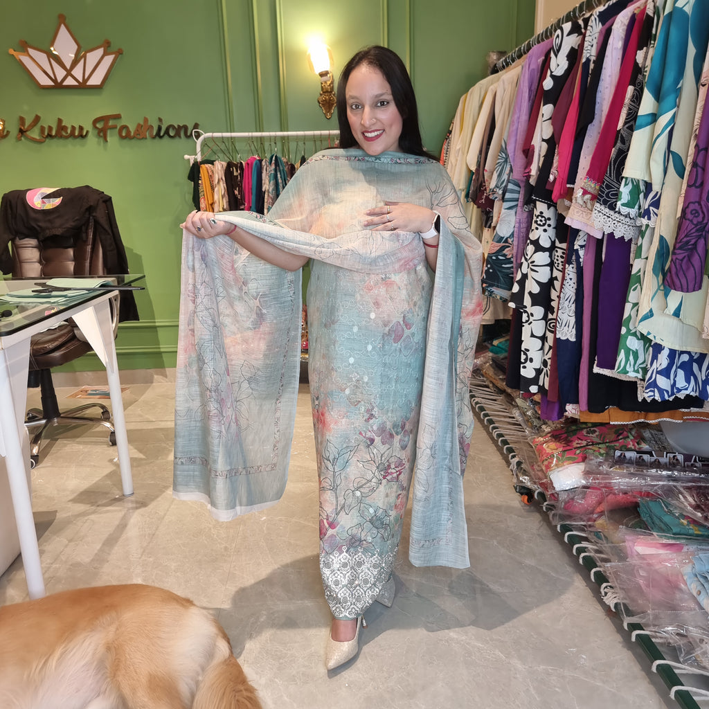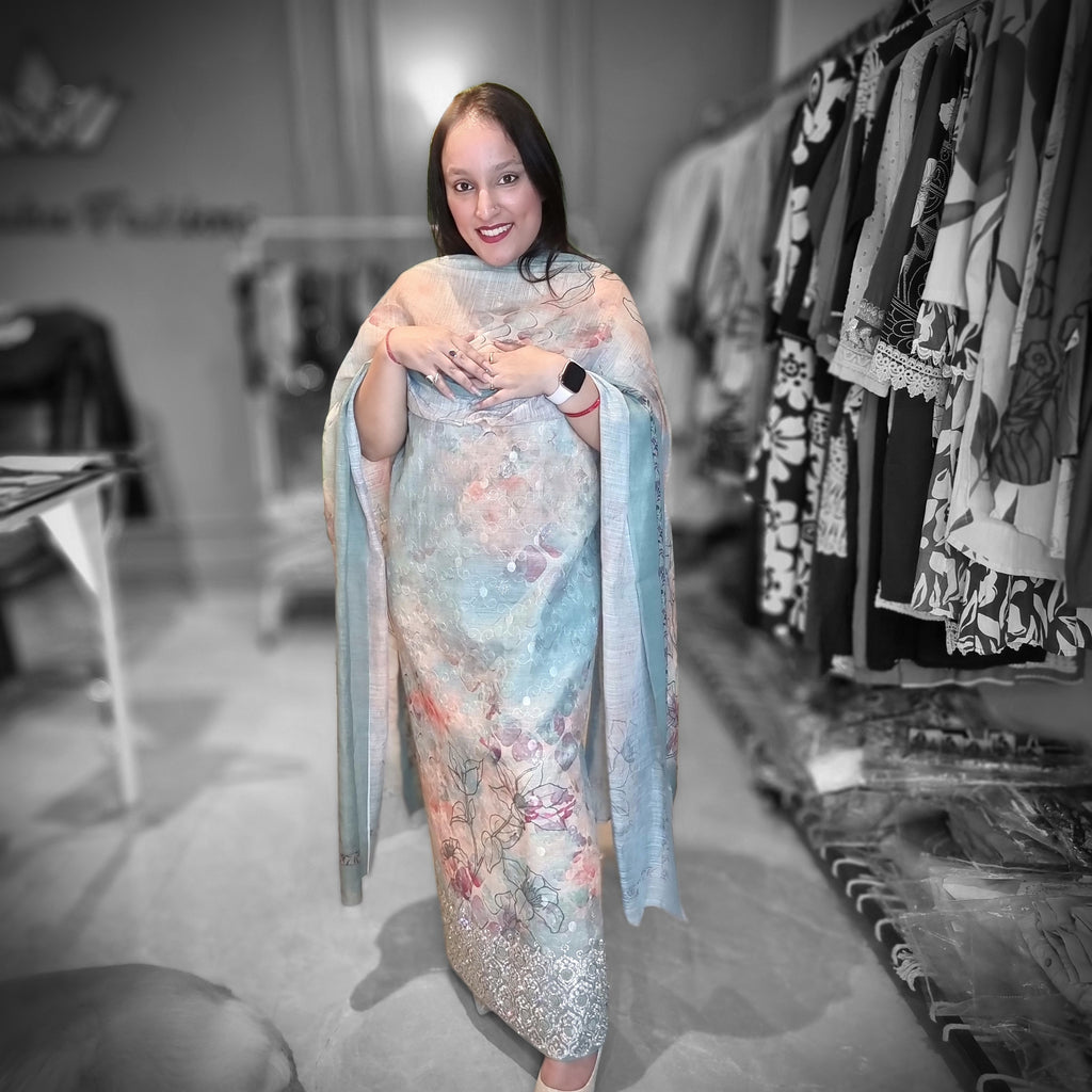 Grace your wardrobe with this Elegant Unstitched Suit in soothing pastel tones. Crafted on a soft, flowy base, the suit is adorned with delicate embroidery and digital floral patterns that add a touch of sophistication. The matching dupatta with subtle design enhances the overall charm, making it an ideal choice for festive occasions, parties, or elegant day gatherings.