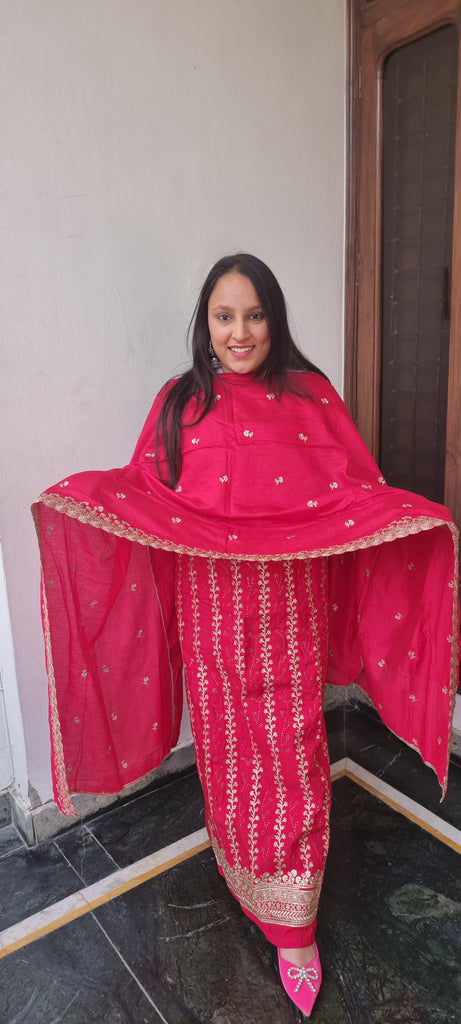 Make a statement in this stunning partywear suit, crafted in a rich ruby pink shade. The suit features intricate embroidery work that adds a touch of regal charm, while the dupatta is fully adorned with elegant embroidery, enhancing its festive appeal. Perfect for weddings, festive gatherings, and special occasions—this ensemble blends tradition with timeless style.