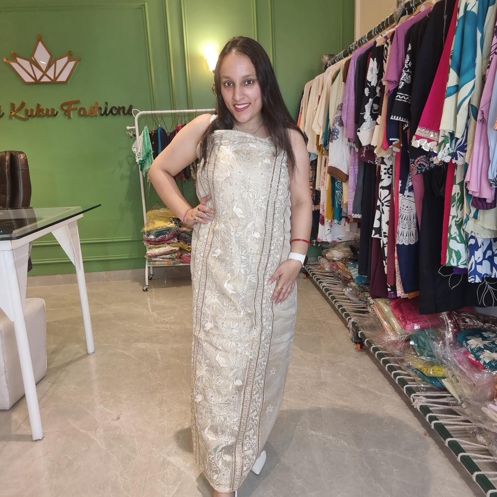 Featuring a luxurious shimmer base enhanced with intricate full embroidery work, this piece is perfect for festive occasions and celebrations. The set comes with a beautifully crafted dupatta adorned with delicate embroidery and subtle golden border, adding the perfect finishing touch.