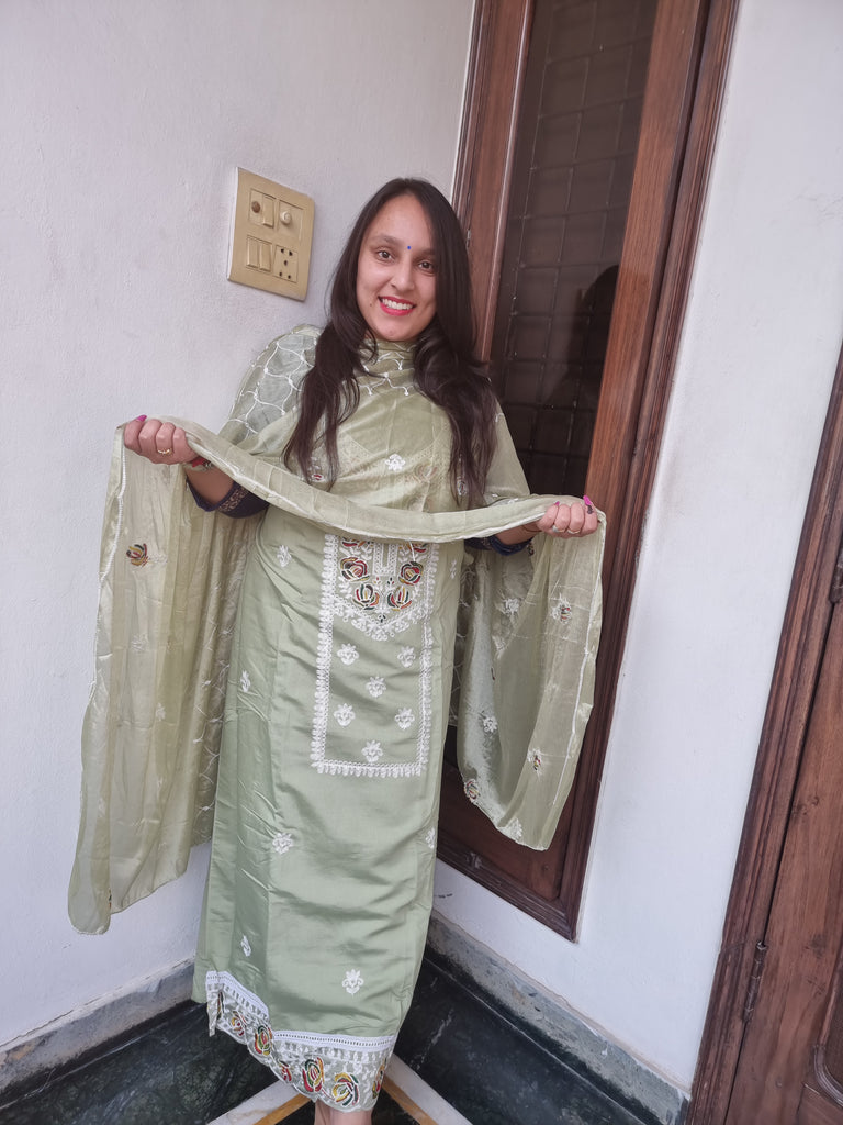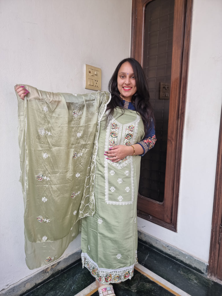 Elevate your style with Olive Grace, a beautifully handcrafted cotton suit set designed for elegance and comfort. This three-piece ensemble features intricate Chikankari embroidery with delicate floral patterns, adding a touch of timeless charm. The breathable cotton fabric ensures all-day ease, making it perfect for casual wear, office attire, or festive gatherings. Paired with an embroidered cotton dupatta, this outfit is a must-have for those who love effortless sophistication.