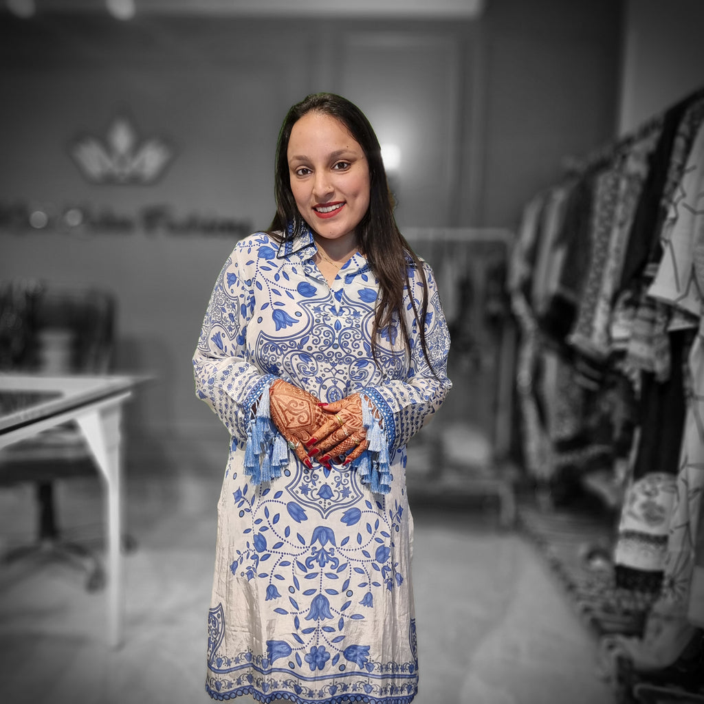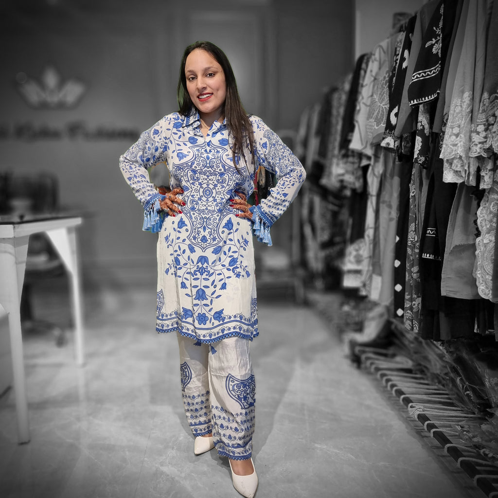 Step into effortless elegance with our Blue Willow Charm Cordset, crafted in premium crepe fabric. This beautifully printed set features intricate blue floral and motif patterns on a pristine white base — giving you a refreshing and graceful look. The soft crepe fabric ensures all-day comfort, while the straight-fit pants and stylish kurta with tassel-detailed sleeves add a touch of sophistication.