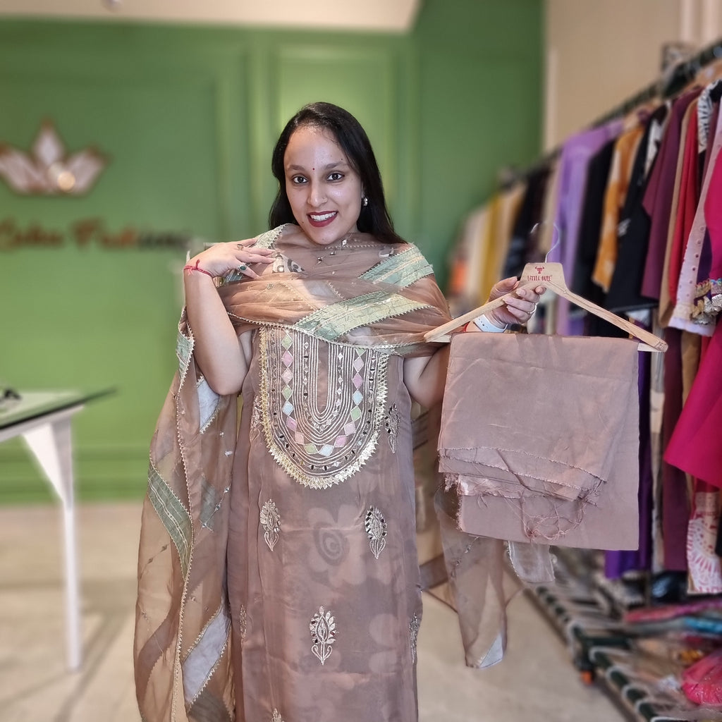 Turn heads at any occasion with this stunning unstitched partywear suit. Crafted in a rich earthy brown shade, the outfit is adorned with delicate floral motifs and intricate embroidery work that adds timeless elegance. The matching organza dupatta, detailed with pastel green and silver striped borders, gives a luxurious touch to the ensemble.