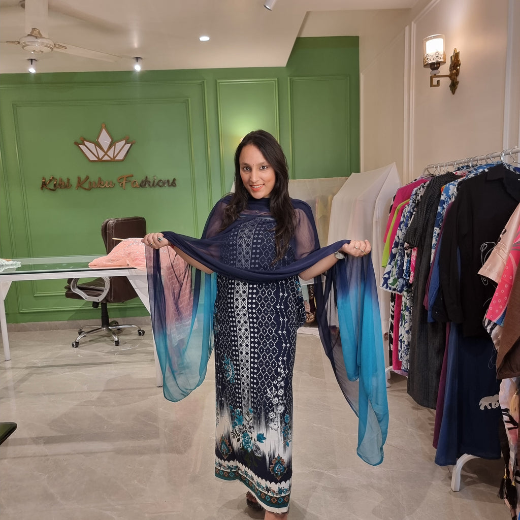 ✨ Dupatta: Lightweight ombré chiffon with a gradient blue effect