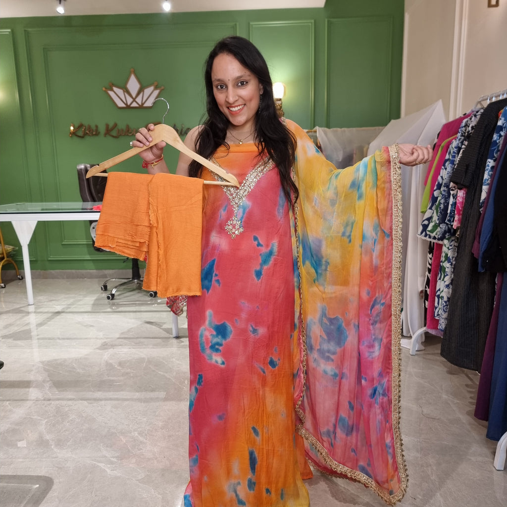 Add a burst of color to your wardrobe with our "Sunset Mirage" Unstitched Tie-Dye Suit. This vibrant ensemble features a mesmerizing blend of warm and cool hues, creating a striking tie-dye effect. The suit is adorned with delicate embellishments around the neckline, adding a touch of elegance to its boho-chic appeal.