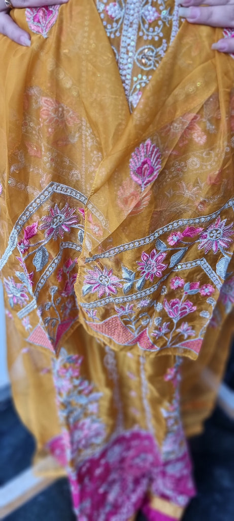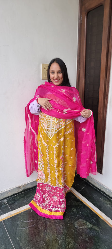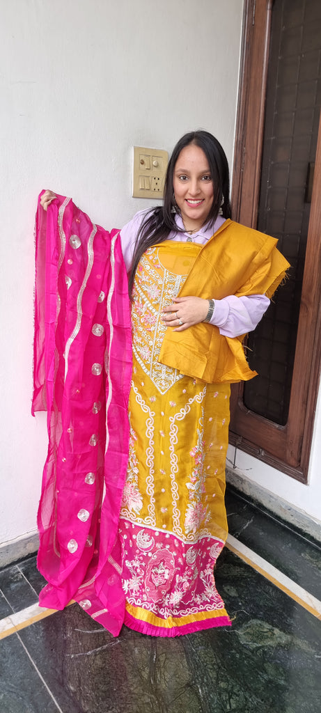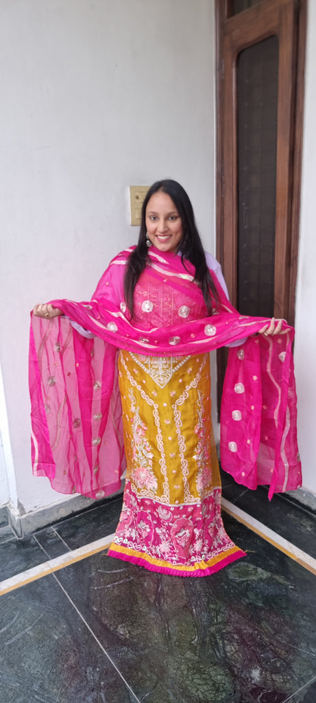 The striking yellow suit is beautifully adorned with delicate embroidery, enhancing its regal charm. Paired with a hot pink contrast dupatta featuring intricate heavy embroidery work, this ensemble is a perfect choice for festive occasions, weddings, and celebrations. The soft lining ensures comfort, making it as easy to wear as it is gorgeous to look at.