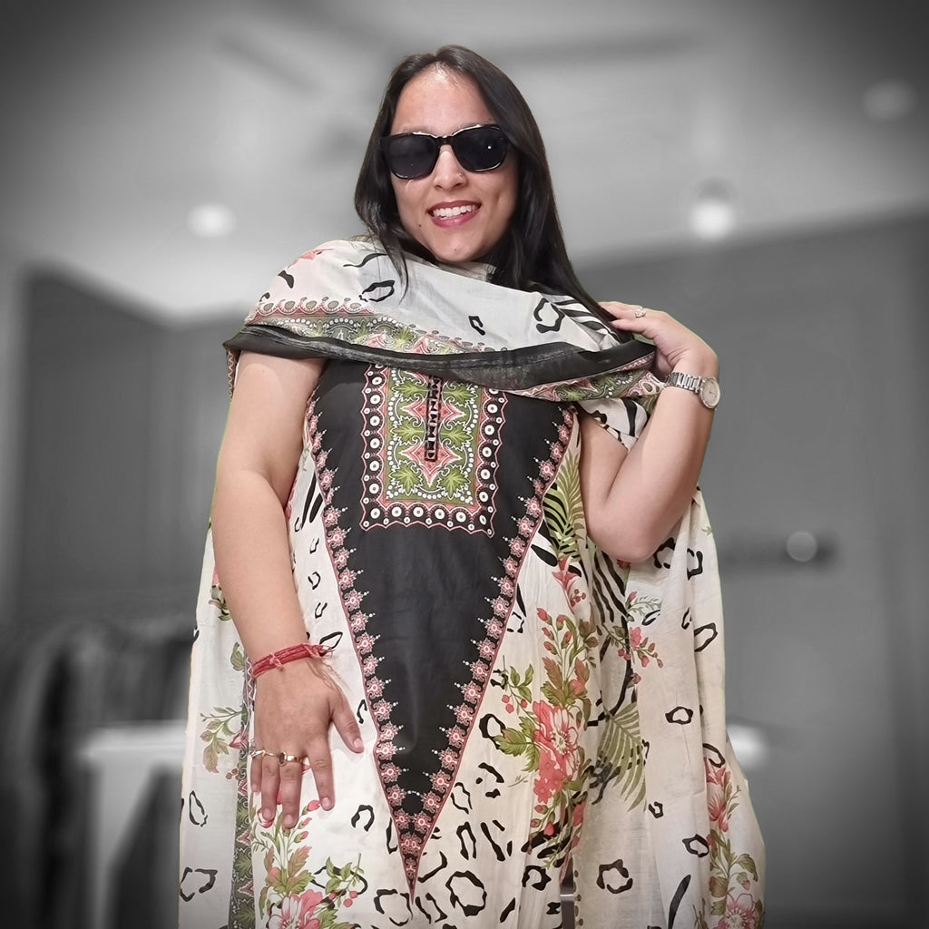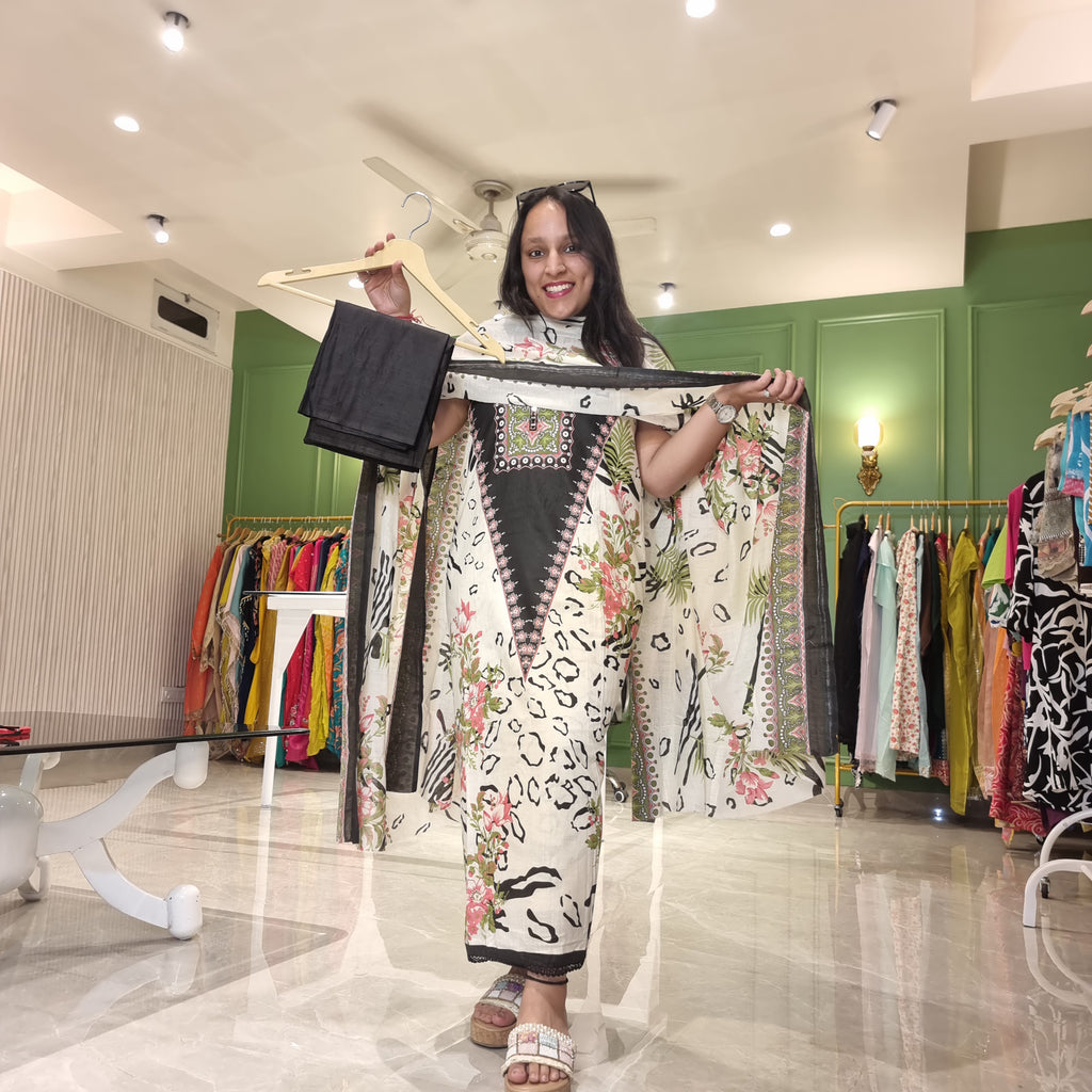Add a touch of sophistication to your wardrobe with this stylish cotton suit set. Featuring a unique combination of floral and animal prints, this ensemble blends contemporary fashion with traditional elegance. The kurta showcases intricate embroidery on the neckline, enhancing its appeal. Paired with a solid black bottom and a matching printed dupatta, this set is perfect for casual outings, festive celebrations, and daily wear.